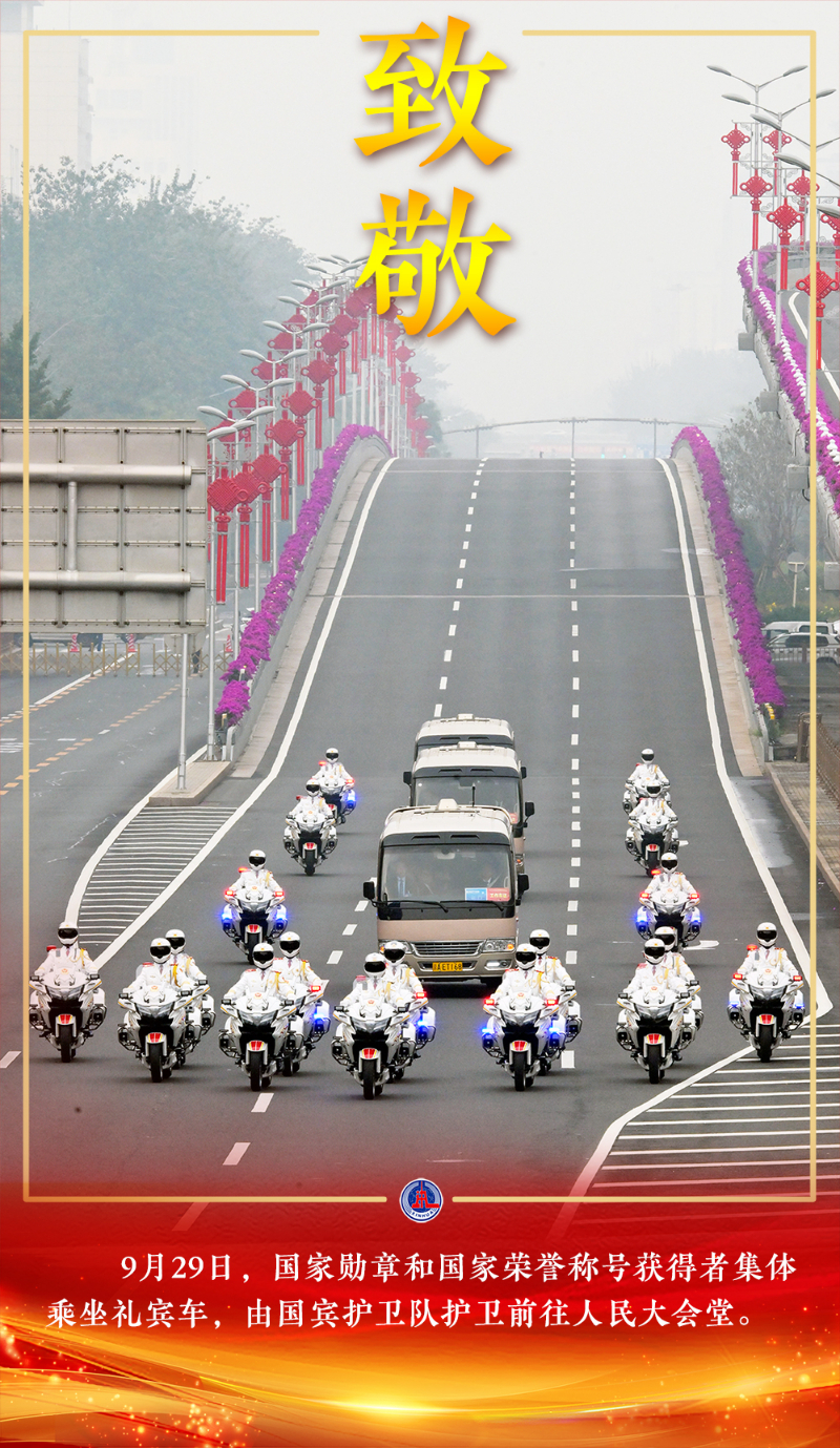 9月29日,國家勛章和國家榮譽(yù)稱號獲得者集體乘坐禮賓車,由國賓護(hù)衛(wèi)隊(duì)護(hù)衛(wèi)前往人民大會(huì)堂。