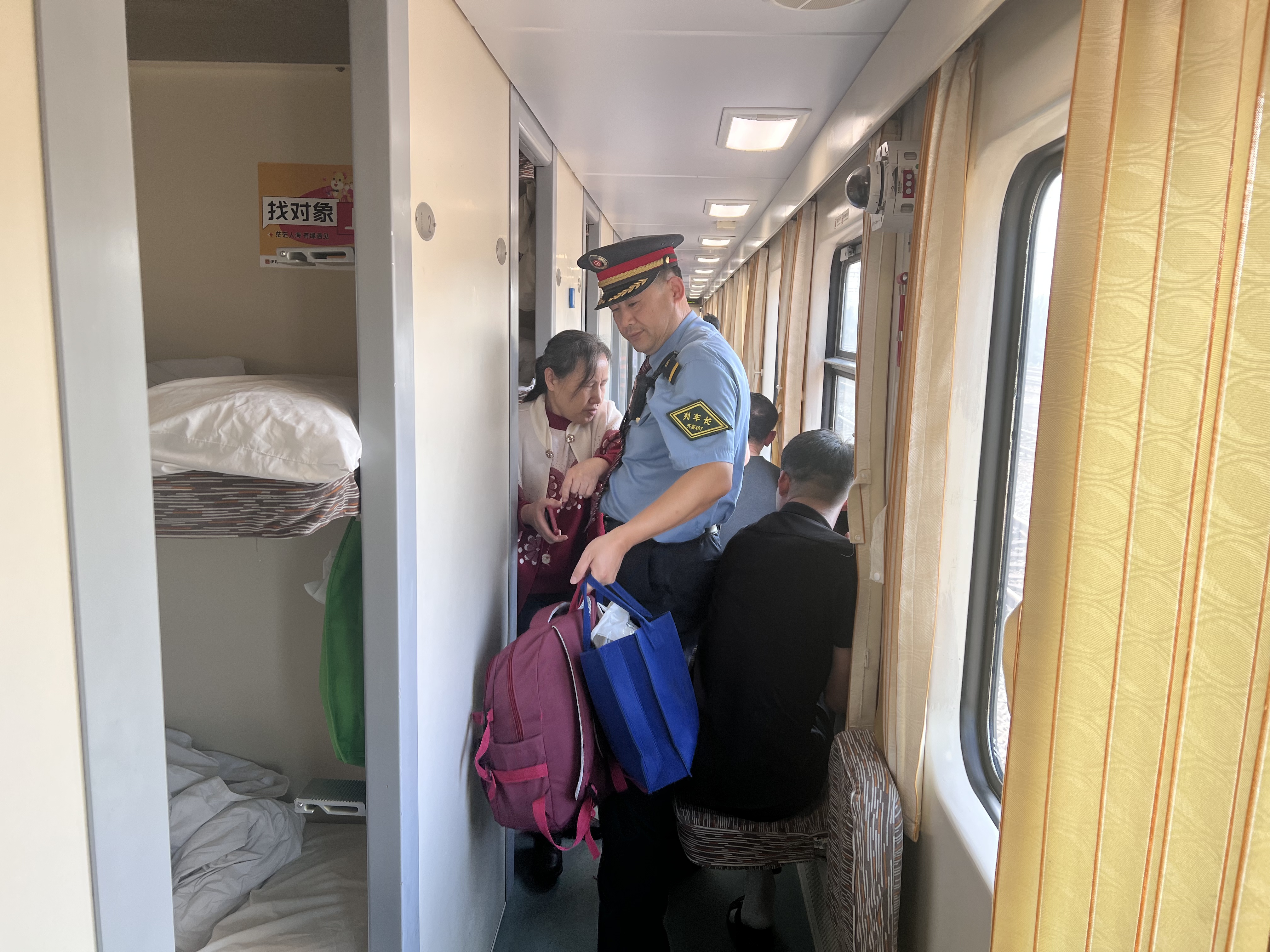 在旅途中,列車長劉鑫每巡視一次車廂,就留心觀察盲人旅客動態(tài),本著有需求有服務(wù),無需求無干擾的原則,叮囑車廂乘務(wù)員隨時留意旅客的動態(tài),及時為旅客送水送餐??紤]到盲人旅客是位女士,劉鑫特意將班組女乘務(wù)員調(diào)至本節(jié)車廂值班,方便隨時為盲人旅客服務(wù),攙扶其如廁。當列車即將抵達旅客目的地時,列車長劉鑫提前與車站工作人員溝通,確保盲人旅客能夠順利出站。