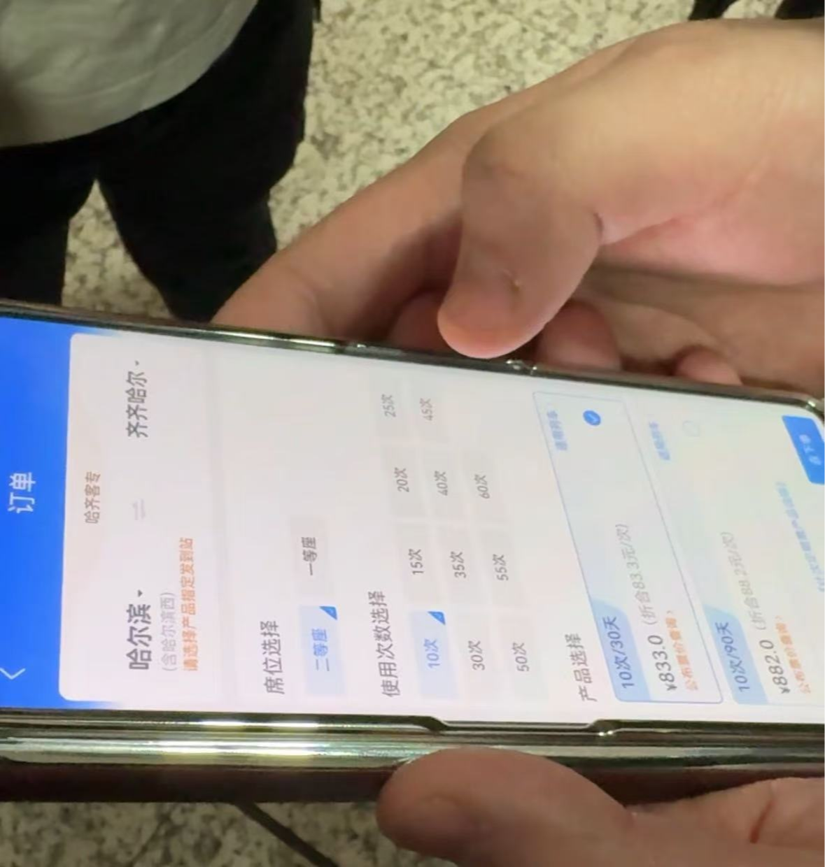 “計(jì)次票對(duì)我來說很方便?!甭每脱τ昝日f,她在哈爾濱上班,父母都在佳木斯,她差不多兩三周就要回佳木斯探親一趟。以前正常在手機(jī)上買票,但是如果遇到節(jié)假日購票什么高峰時(shí),很有可能沒有票,所以都得提前購票,時(shí)間不夠靈活。但是買了計(jì)次票之后,她隨時(shí)想走就能走,還可以提前約座,如果沒座可以直接刷身份證進(jìn)站,時(shí)間也較為靈活。對(duì)于薛雨萌來說,計(jì)次票還有的好處就是票價(jià)優(yōu)惠,比她正常購票相當(dāng)于打了9折。還有就是這種新增票型也非常適合她。以往薛雨萌關(guān)注的票型是20次/90日,過于她的實(shí)際需求沒有這么多。新增的10次/90日票型,正好切入薛雨萌的出行需求。