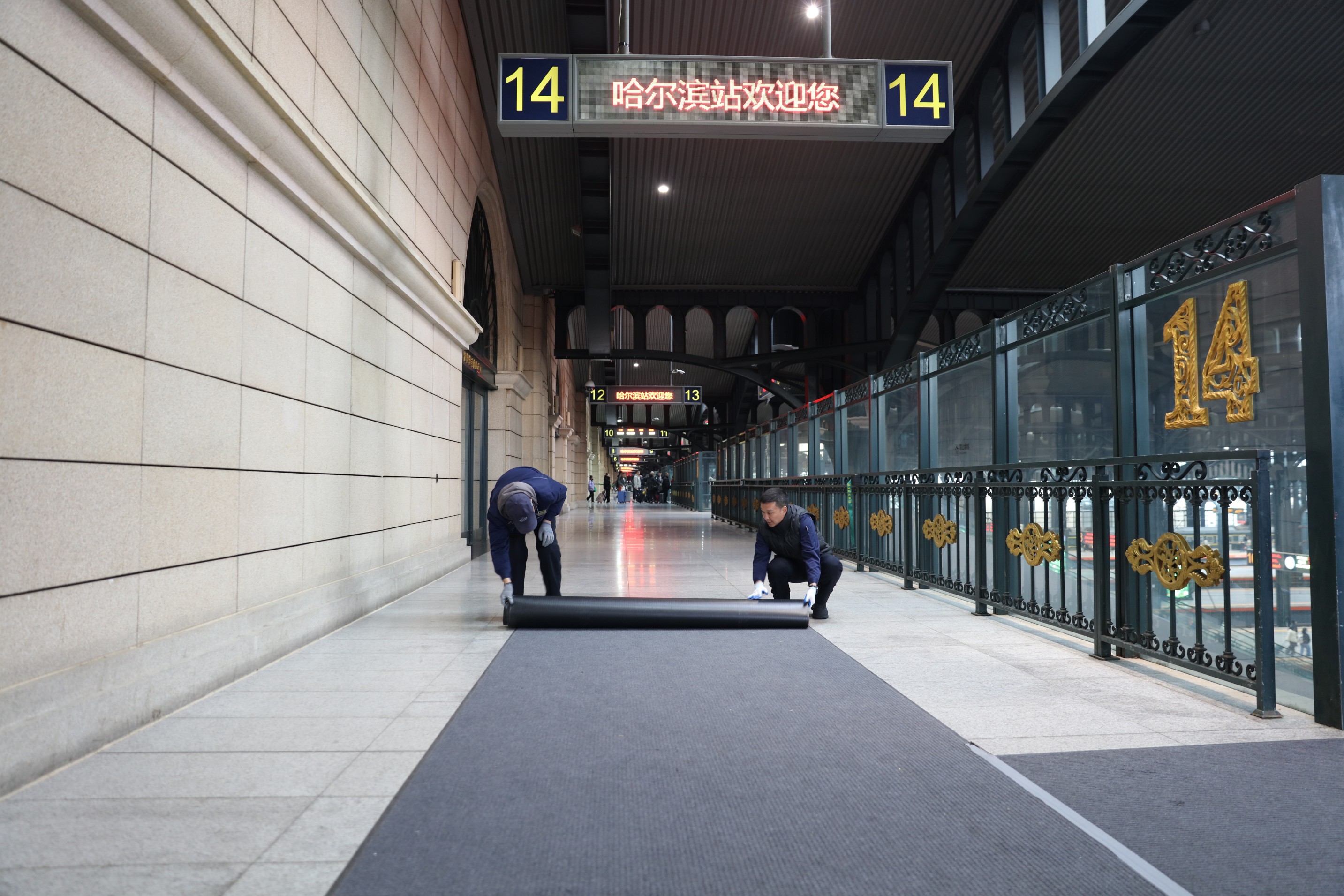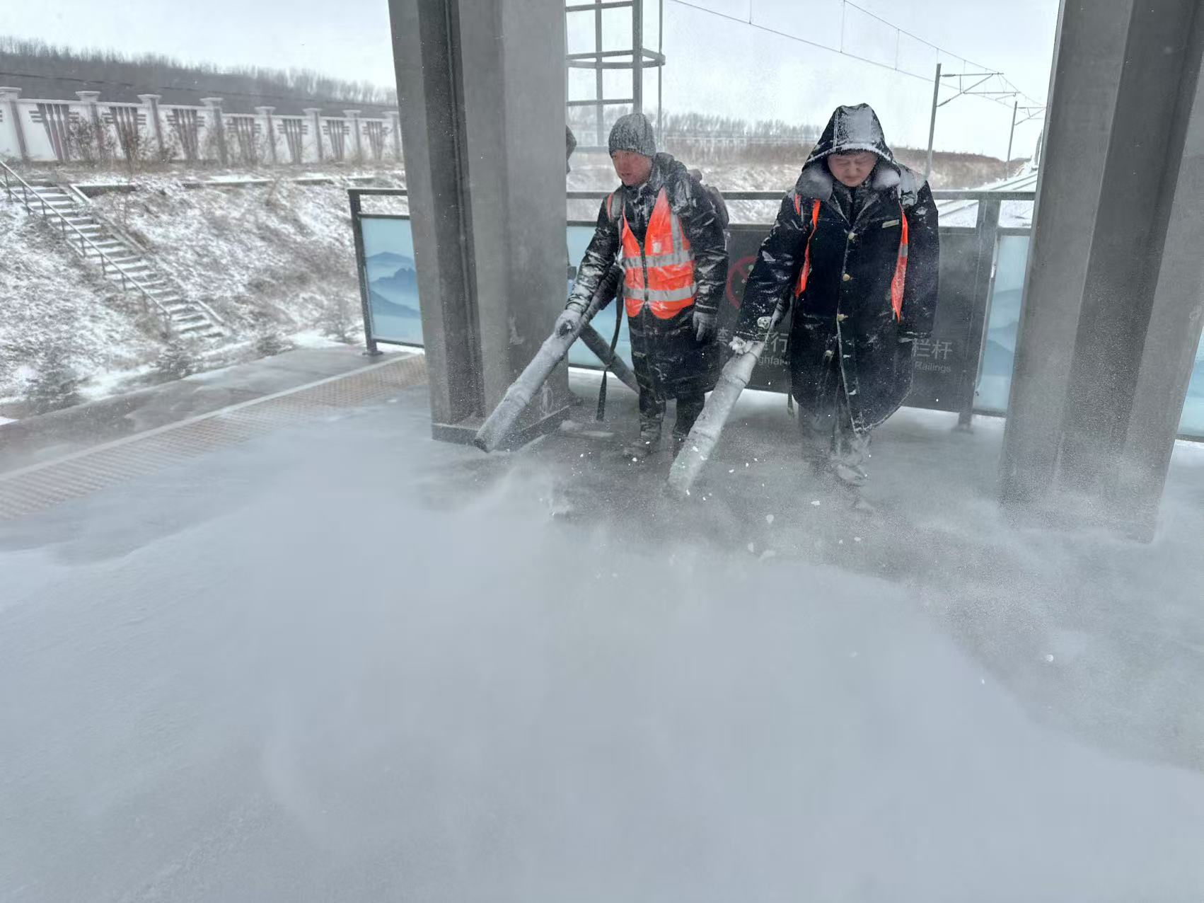 為保障降雪期間旅客平安出行,省內(nèi)主要車站通過車站廣播、電子屏幕向旅客發(fā)布列車運行情況,采取開放全部自動售票機(jī)和增加人員窗口等措施,方便旅客購票;車站設(shè)專人在進(jìn)站口、檢票口、出站口等關(guān)鍵地段防護(hù),采取在主要通道口處鋪設(shè)防滑毯,放置安全提示牌以及提前檢票等方式,確保旅客安全乘降。