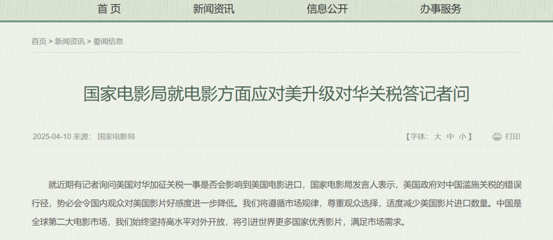 就近期有記者詢問美國對華加征關(guān)稅一事是否會影響到美國電影進(jìn)口,國家電影局發(fā)言人表示,美國政府對中國濫施關(guān)稅的錯誤行徑,勢必會令國內(nèi)觀眾對美國影片好感度進(jìn)一步降低。我們將遵循市場規(guī)律,尊重觀眾選擇,適度減少美國影片進(jìn)口數(shù)量。中國是全球第二大電影市場,我們始終堅(jiān)持高水平對外開放,將引進(jìn)世界更多國家優(yōu)秀影片,滿足市場需求。