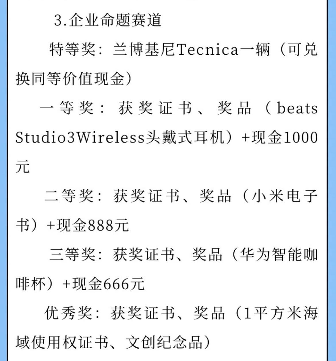 在獎(jiǎng)項(xiàng)設(shè)置方面,企業(yè)命題賽道特等獎(jiǎng)是蘭博基尼Tecnica一輛(可兌換同等價(jià)值現(xiàn)金)。