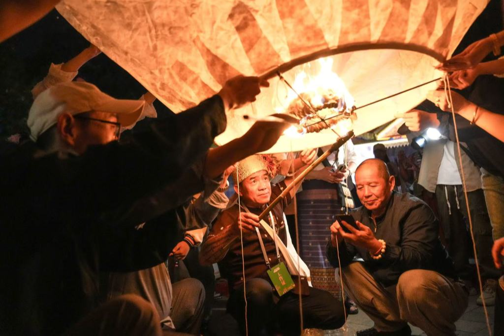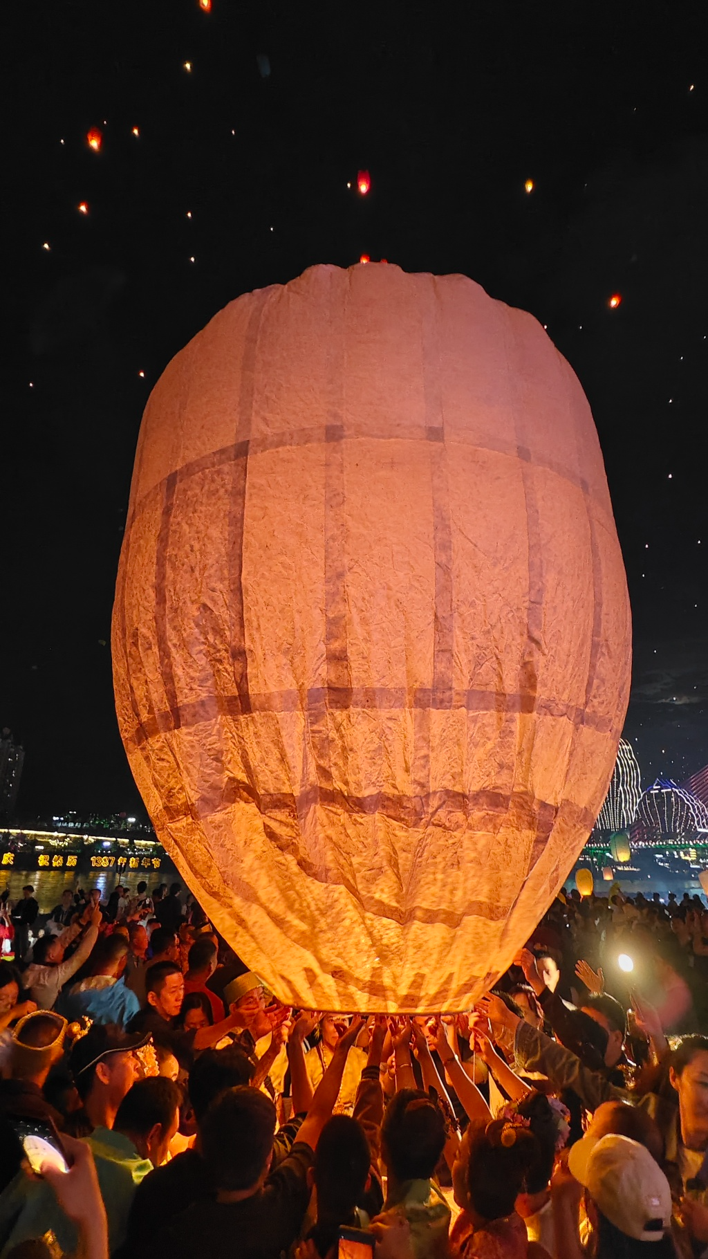 當(dāng)天,西雙版納傣族人民迎來一年一度的傳統(tǒng)節(jié)日——傣歷新年節(jié)。當(dāng)天晚上,西雙版納機(jī)場航班停飛部分時段,讓出天空,數(shù)萬名身著盛裝的傣族群眾與來自全國各地的游客,共同點(diǎn)燃一盞盞寫滿美好祝福的孔明燈,瀾滄江兩岸天空在一輪圓月照耀下,展現(xiàn)出“天上星河轉(zhuǎn),人間燈火明”的美麗浪漫畫卷。