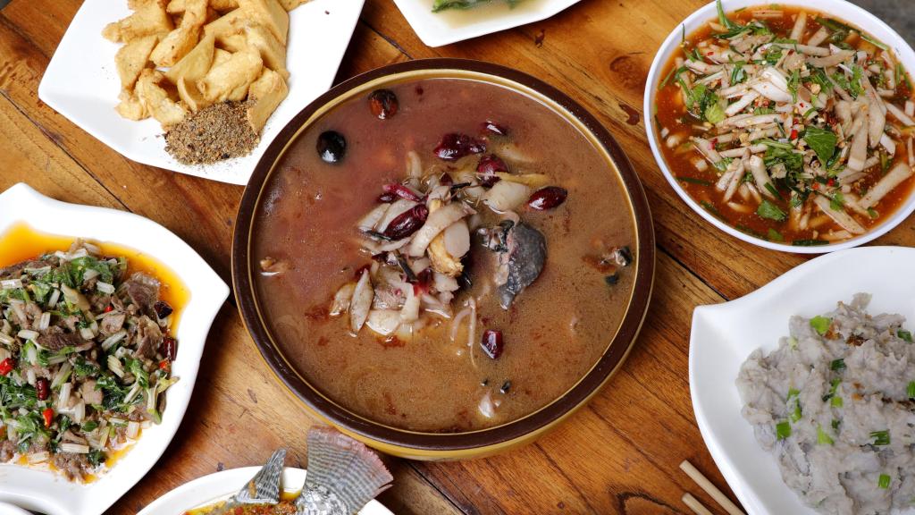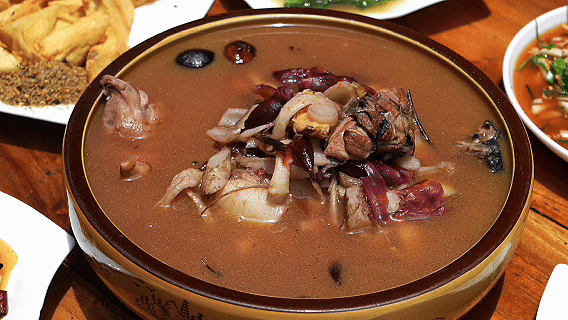 人們精選雞刺根、小紅蒜、茴香根等數(shù)十味藥根食材,配以土雞、排骨文火慢燉成湯。