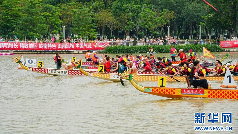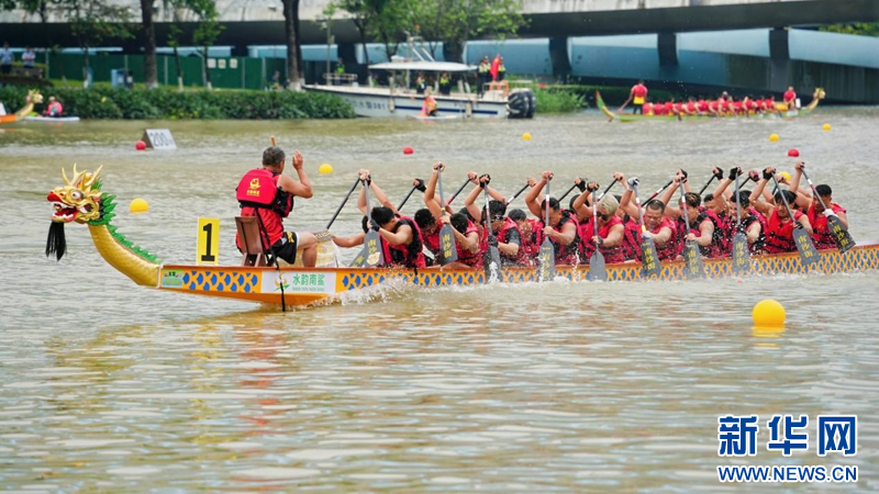 龍舟隊(duì)伍齊心協(xié)力、奮楫前行。新華網(wǎng)發(fā) (廣州南沙區(qū)委宣傳部 供圖)