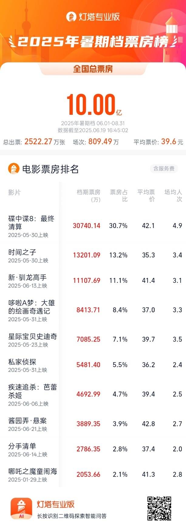 2025年暑期檔票房破十億 圖據(jù)燈塔專業(yè)版