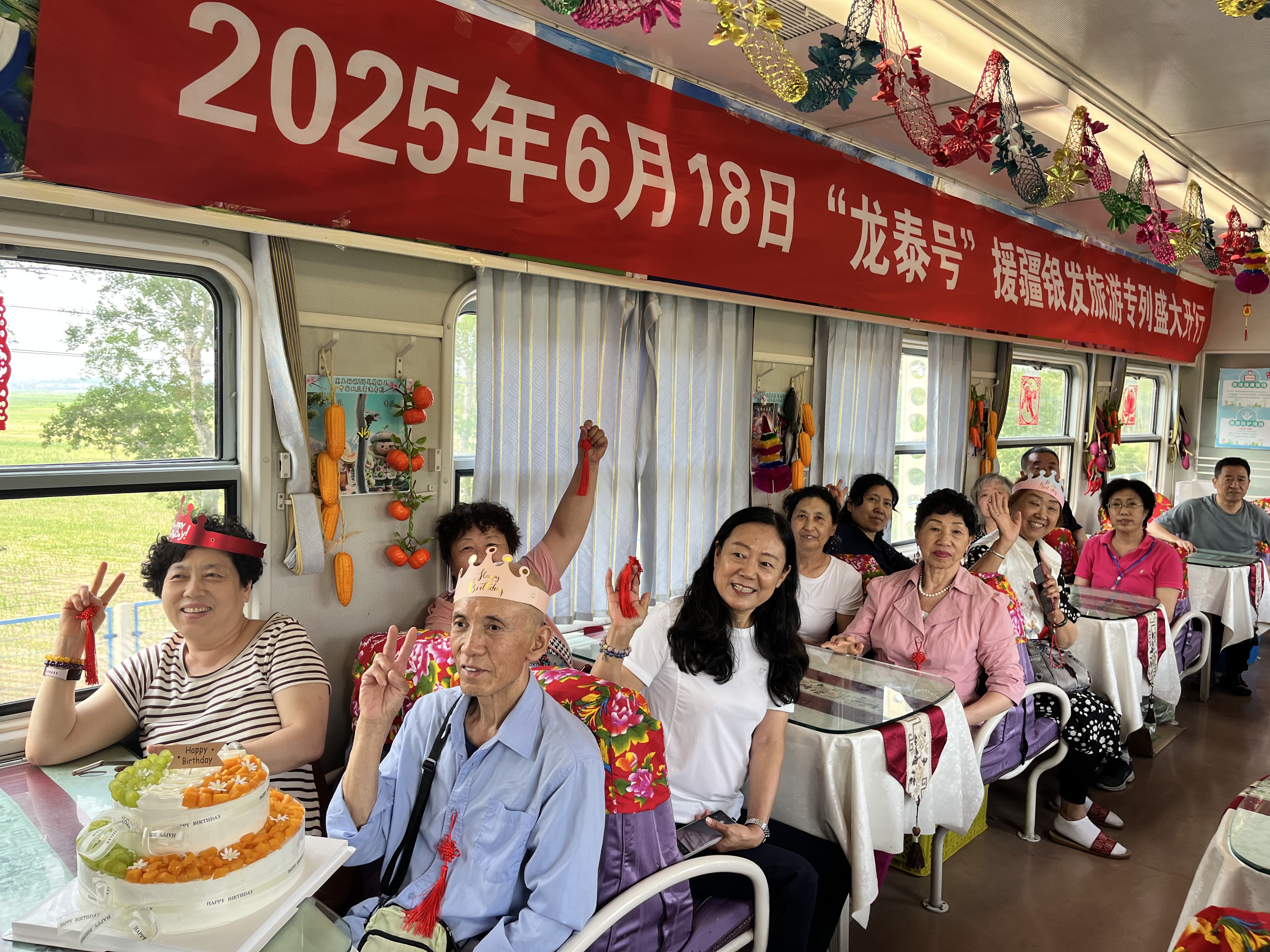 擔(dān)當(dāng)乘務(wù)工作的齊齊哈爾客運(yùn)段結(jié)合鐵路風(fēng)景第二季“美好旅途、文化相伴”主題活動(dòng),列車上給旅客布置了東北特色車廂文化和服裝道具。旅客們?cè)谲噹镙d歌載舞,同行的旅客們紛紛拿起手機(jī),記錄身邊的文明景象,傳播鐵路文化,展示中華文化。同時(shí),列車工作人員還在這個(gè)特殊的日子為劉穎女士和付雨利先生準(zhǔn)備了生日蛋糕,劉穎女士開心地表示:這是她過得最有意義、最特殊的一個(gè)生日,沒想到在列車上也能有生日蛋糕和大家的祝福,希望以后還要帶著老伴、閨蜜團(tuán)再次乘坐這趟列車。