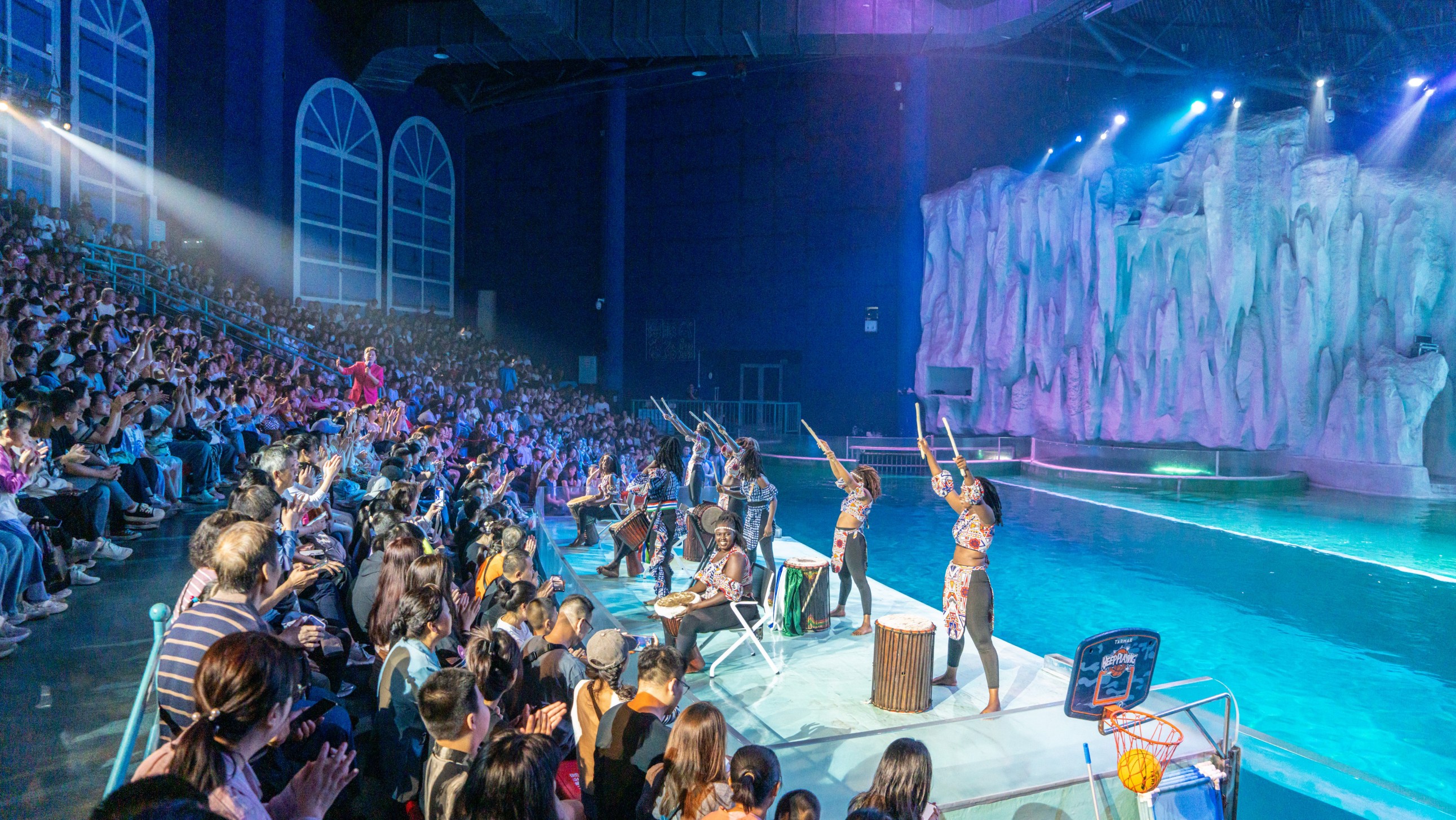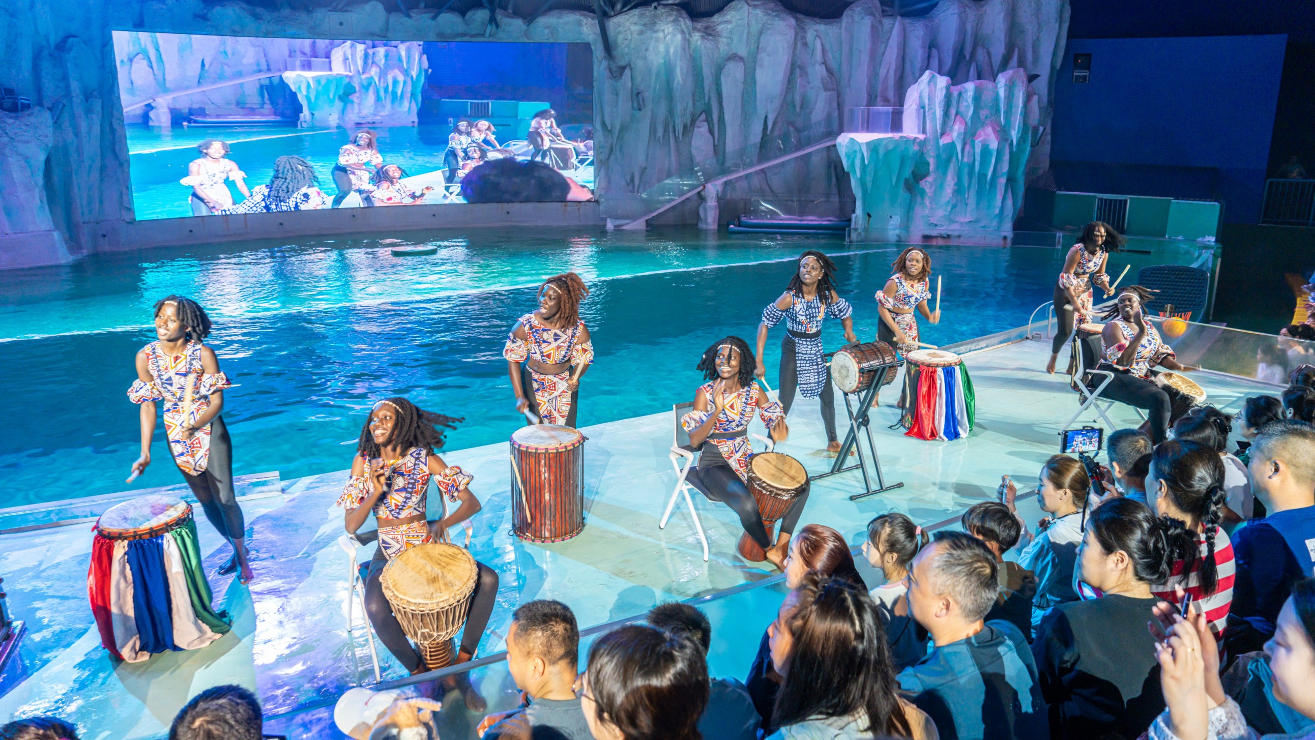 在極地公園海豚秀開場,藝術(shù)團(tuán)傾情上演經(jīng)典節(jié)目《班珠爾達(dá)姆巴——堅韌的節(jié)奏》,這場演出節(jié)目曾多次登上國家級舞臺,9位身著民族傳統(tǒng)服飾的岡比亞姑娘以震撼人心的鼓樂與舞蹈,詮釋著女性在非洲音樂世界中的變革力量。激越的非洲鼓點響徹場館,裹挾著野性與生命力,瞬間點燃全場熱情,游客的掌聲與喝彩聲如潮,紛紛沉浸在這場跨越國界的藝術(shù)盛宴中。