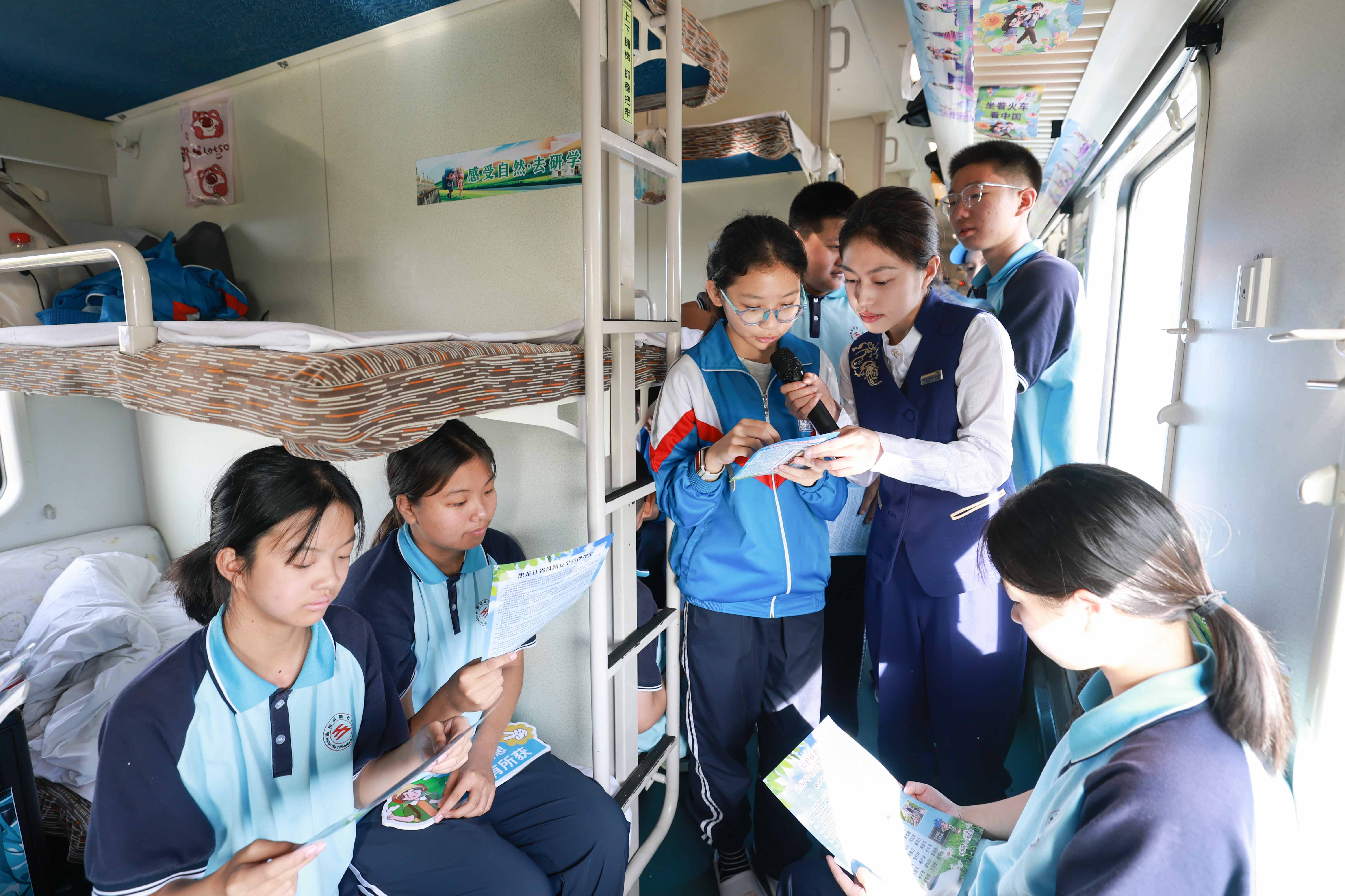 為豐富研學體驗,擔當此次乘務任務的齊齊哈爾客運段提前精心打造主題車廂,車窗上張貼“讀萬卷書,行萬里路”勵志標語,走廊兩側點綴鐵路主題剪貼畫,讓車廂內研學氛圍十足。同時,該段還策劃“愛路護路”主題宣講、發(fā)放鐵路主題書簽等活動;列車青年志愿者化身“旅游推薦官”,以窗外流動的風景為天然課堂,伴隨列車一路前行,讓學生們在旅途中深度感受“寓教于樂、融學于趣、化教于心”的研學魅力。