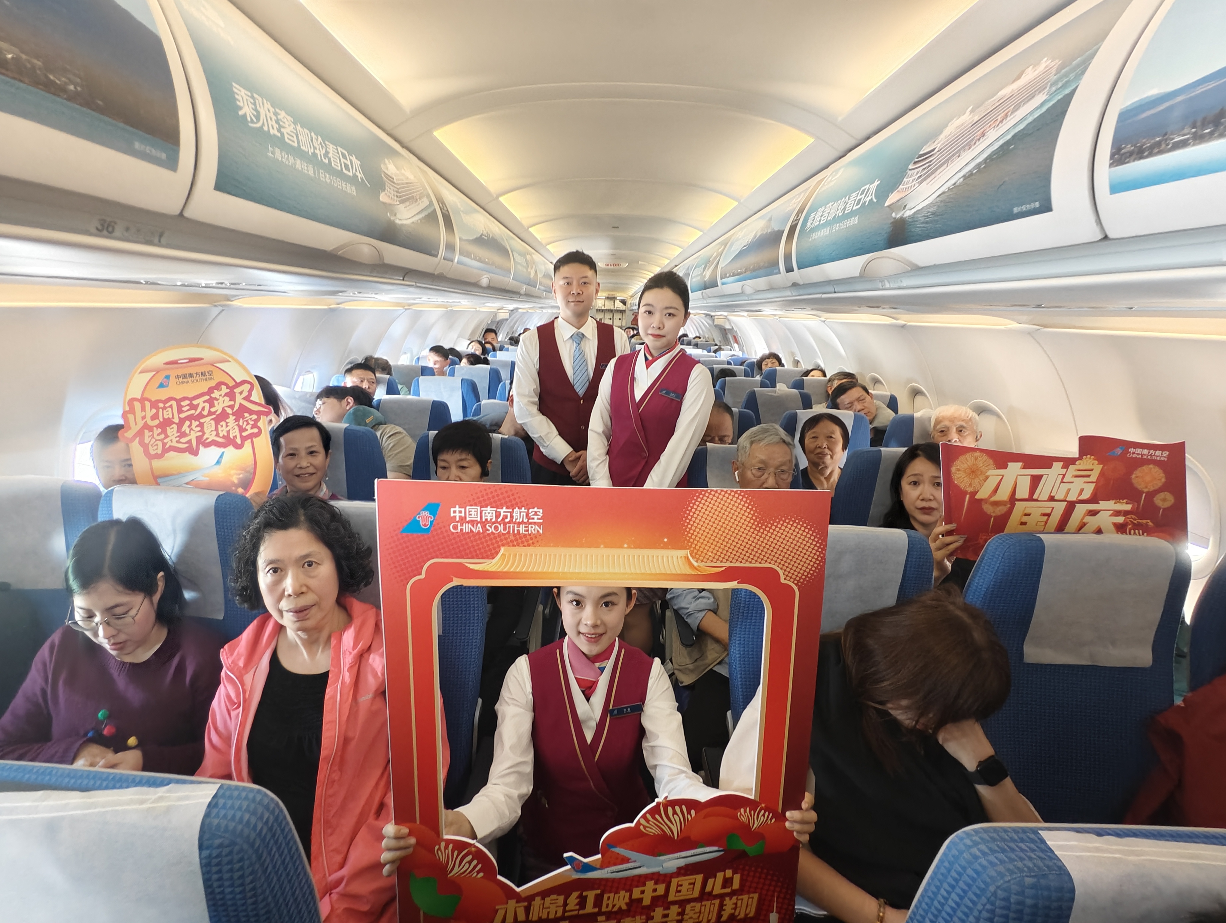 當(dāng)日清晨,CZ6273航班客艙已換上“國(guó)慶盛裝”。乘務(wù)員身著整齊制服,提前等候在艙門口,以“歡迎搭乘國(guó)慶主題航班”的專屬問候,迎接每位旅客登機(jī),讓旅客剛踏入客艙便感受到濃厚的節(jié)日氛圍。?