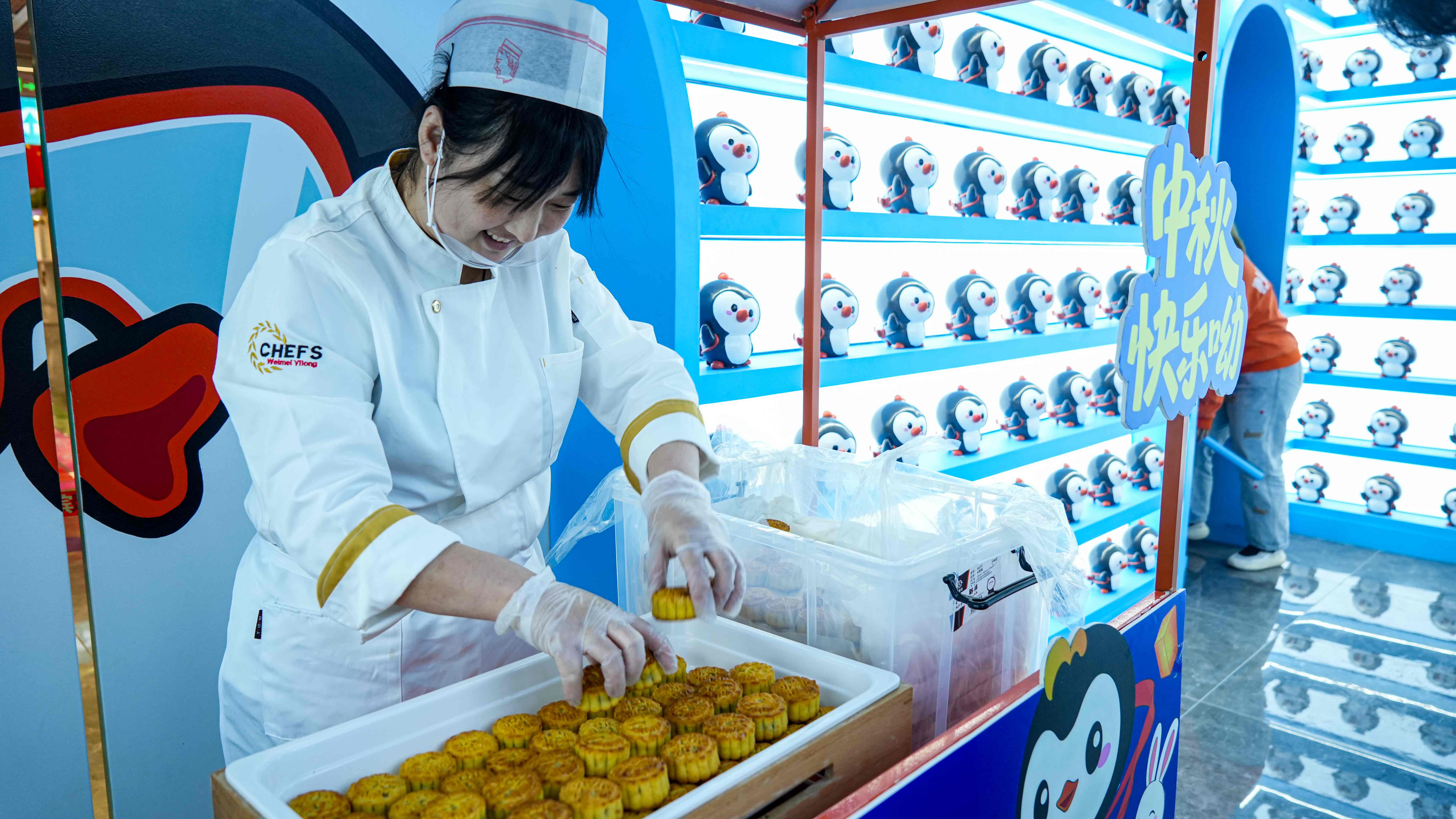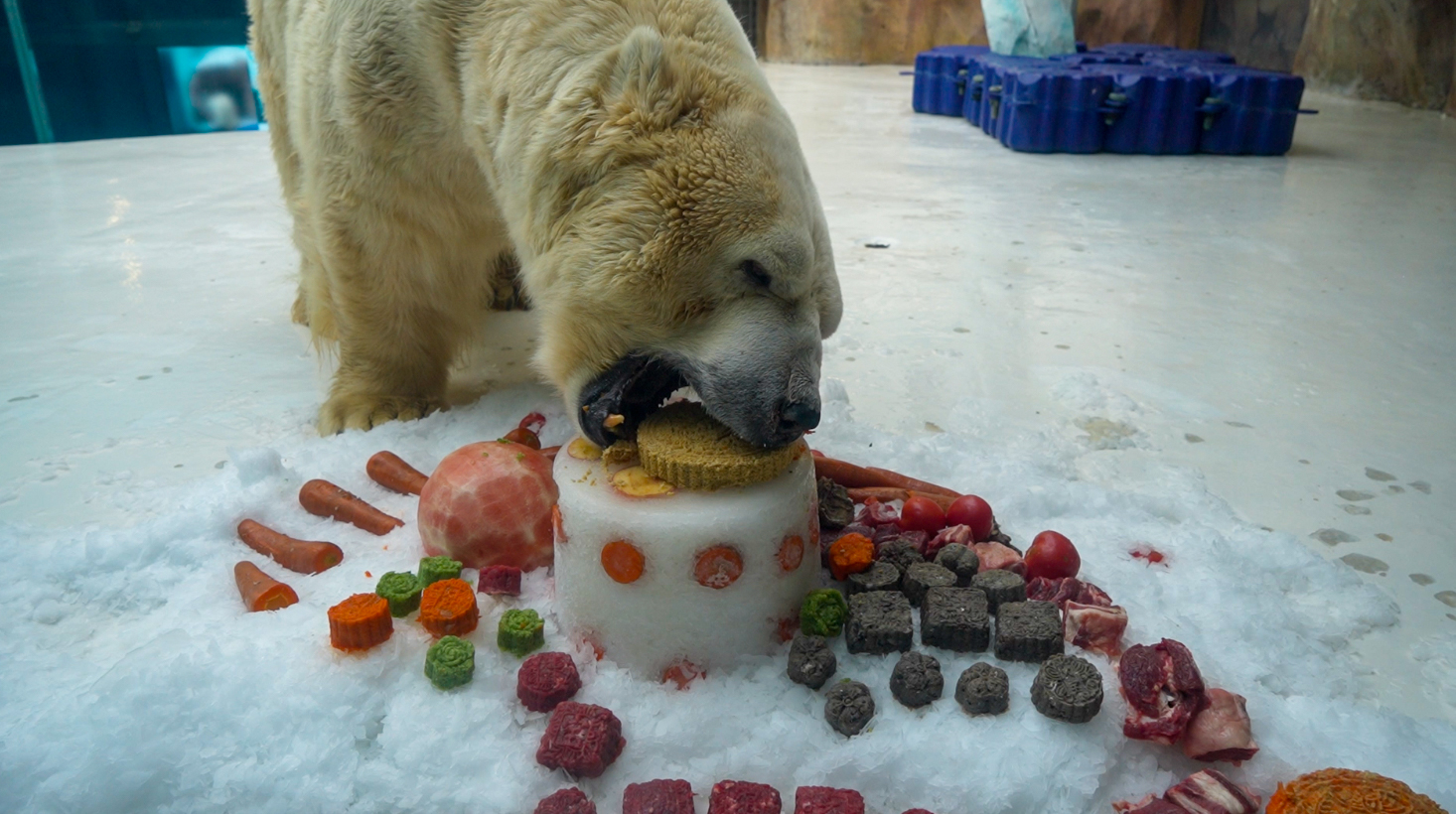 溫情暖意同樣流淌在游客手中。走進哈爾濱極地公園,游客驚喜地收到了極地公園特制的純手工月餅,每一塊都飽含祝福與心意,傳遞著中秋團圓的溫暖。極地動物明星們也收到了專屬中秋禮物。北極熊兄弟大寶和笨笨享用了它們最愛吃的牛肉、西瓜以及營養(yǎng)豐富的胡蘿卜、黃瓜、玉米等制作的超大月餅;紅遍全網(wǎng)的小獅子明星“小毛”也吃上了由牛肉、雞肉制作的純?nèi)庠嘛灒缓1獋儎t品嘗了由大青魚、多春魚、挪威冰魚等新鮮魚類特制的海鮮月餅。極地動物們的中秋“團圓餐”吸引眾多游客駐足觀賞,在歡聲笑語中共慶中秋佳節(jié)。