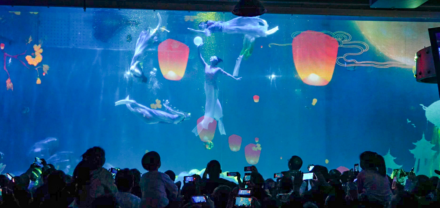 全新打造的“國風水舞秀”驚艷上演。五位頂尖水舞藝術(shù)家身著紅色古風服飾,在魚群環(huán)繞中翩然起舞。水光交織之間,傳統(tǒng)文化與極地美學完美融合,呈現(xiàn)出一場美輪美奐的視覺盛宴。