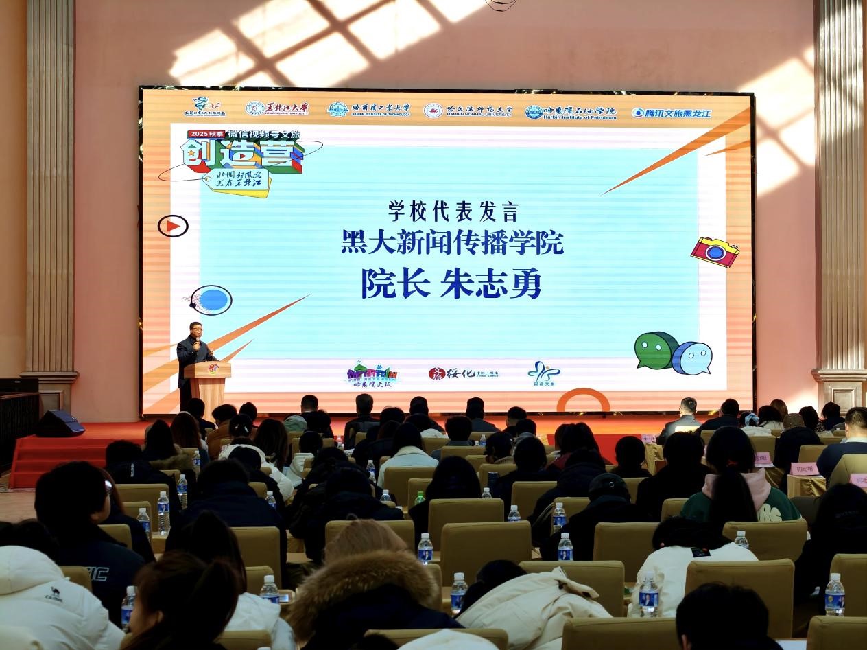 黑龍江大學新聞傳播學院院長朱志勇作為學校代表致辭。他提到,自2021年創(chuàng)造營發(fā)起以來,黑龍江大學已培養(yǎng)200余人次學生參與其中,師生走訪省內(nèi)20余個頭部景區(qū),創(chuàng)作出1000余部視頻作品。今年,學校學子與其他三校同仁攜手,在創(chuàng)作中錘煉專業(yè)技能,在實踐中深化產(chǎn)教融合,進一步豐富了“北國好風光·美在黑龍江”的品牌內(nèi)涵。