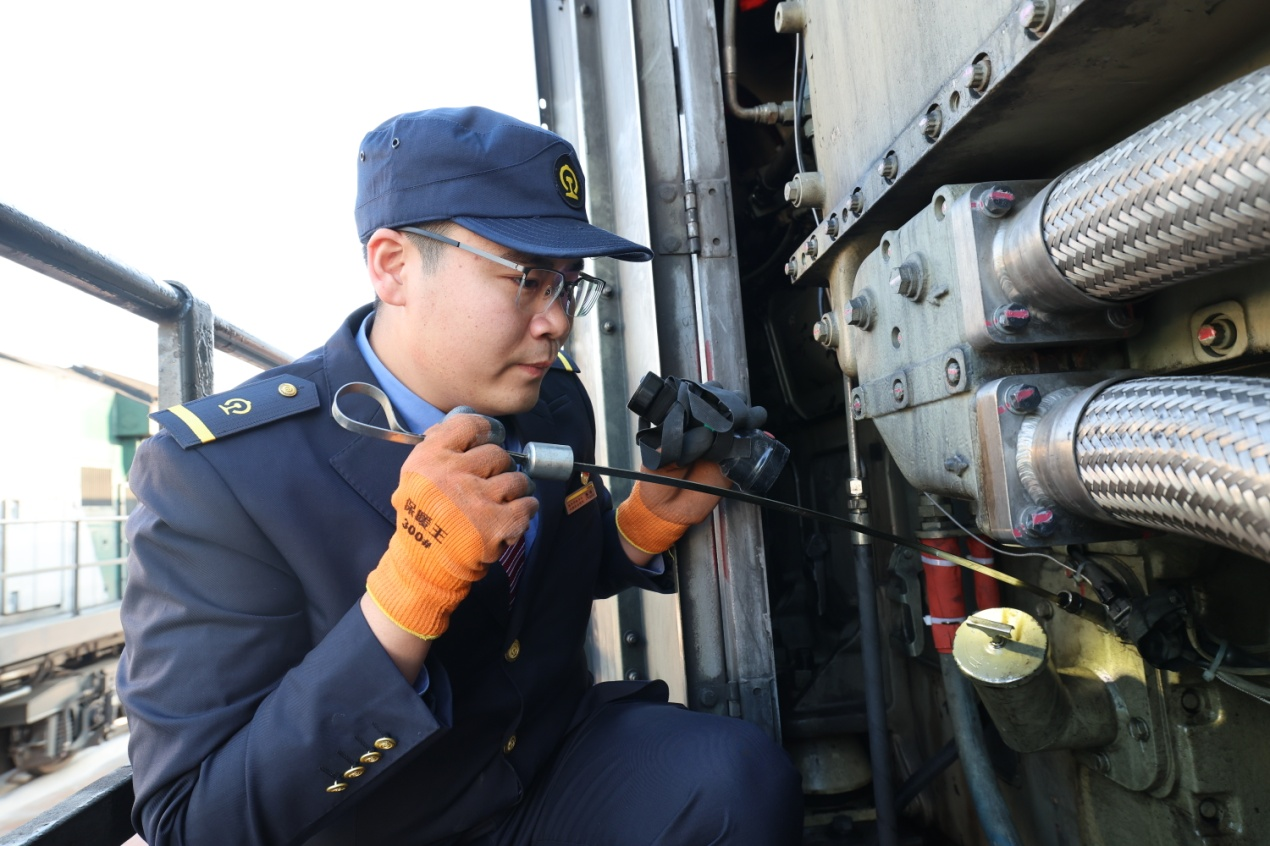 為了保證列車運(yùn)行安全,出庫前,李博要對(duì)機(jī)車進(jìn)行一次全身“體檢”?!皺C(jī)車頭燈雨刷器作用良好,走行部狀態(tài)良好,柴油機(jī)機(jī)油油位正常、轉(zhuǎn)數(shù)正常?!?5點(diǎn)30分,李博在機(jī)車整備庫內(nèi),雙眼仔仔細(xì)細(xì)對(duì)和諧N5型貨運(yùn)機(jī)車做“體檢”,確保機(jī)車“健康”出庫。