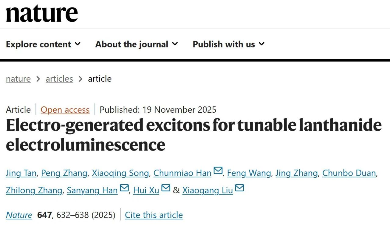 稀土納米晶像大海中一座 “絕緣小島”,唯有光能飛躍“天塹”,激發(fā)她絢麗多彩的光芒,電卻無路可達。黑龍江大學(xué)許輝教授團隊與合作者在“小島”周圍架起無數(shù)有機“光電橋梁”。天塹變通途,讓“電激發(fā)絕緣體發(fā)光”的不可能變?yōu)榭赡堋1本r間2025年11月20日,這項被團隊打磨了十四年的研究成果,以“捕獲電生激子實現(xiàn)可調(diào)諧的鑭系納米晶電致發(fā)光”為題,在線發(fā)表于國際頂級期刊《Nature》。這是黑龍江大學(xué)首篇《Nature》論文,也是黑龍江省化學(xué)學(xué)科首篇《Nature》論文。