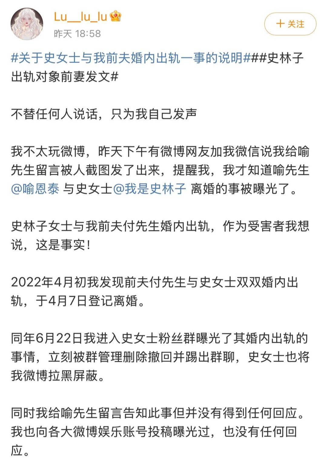 接著,喻恩泰與史林子的共同好友發(fā)文,直指婚變根源是史林子婚內(nèi)出軌。徐璐發(fā)文稱史林子的確與自己前夫付殷正洋婚內(nèi)出軌,導(dǎo)致自己離婚。同時,她在2022年發(fā)現(xiàn)真相后,曾試圖向喻恩泰告知此事,卻未獲回應(yīng),而她在史林子粉絲群曝光此事后被拉黑。