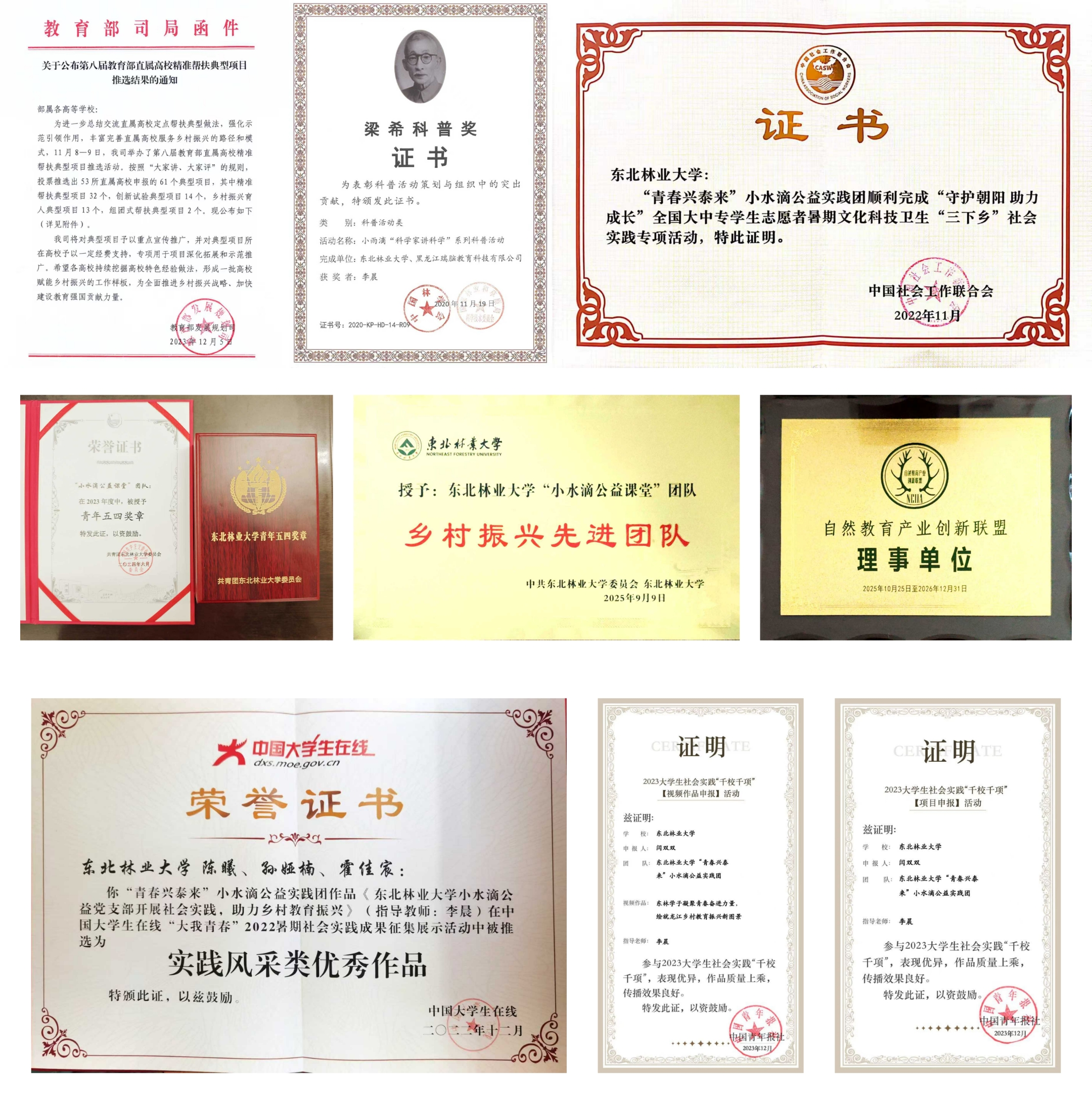 眾多榮譽(yù),是團(tuán)隊(duì)服務(wù)社會(huì)的最好證明。項(xiàng)目獲評(píng)中國大學(xué)生在線實(shí)踐風(fēng)采類優(yōu)秀作品、“守護(hù)朝陽,助力成長(zhǎng)”三下鄉(xiāng)社會(huì)實(shí)踐百所優(yōu)秀高校團(tuán)隊(duì)、大學(xué)生社會(huì)實(shí)踐“千校千項(xiàng)”項(xiàng)目?jī)?yōu)秀和視頻優(yōu)秀、教育部直屬高校精準(zhǔn)幫扶典型項(xiàng)目、梁??破摘?jiǎng)等,以團(tuán)隊(duì)為基礎(chǔ)建立的黨支部成為東北林業(yè)大學(xué)首個(gè)獲得全國黨建工作樣板支部的學(xué)生支部,項(xiàng)目案例在教育部網(wǎng)站發(fā)布并推廣……