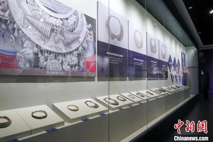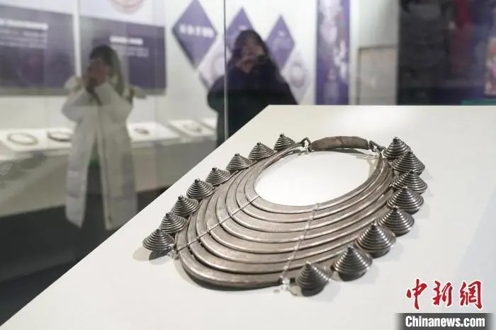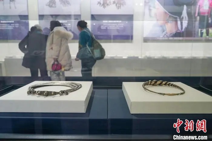 圖為展出的侗族龍鳳紋鏨花三穿銀項(xiàng)圈(左)、苗族繩紋銀項(xiàng)圈。中新社記者 趙宇航 攝