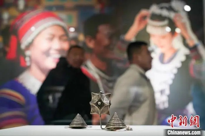 圖為展出的瑤族九方鏨花銀牌腰帶(左)。中新社記者 趙宇航 攝
