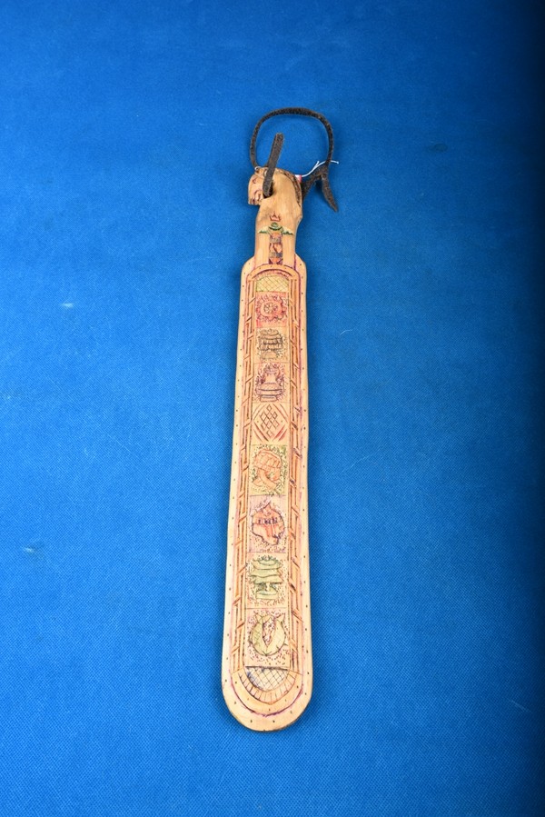 黑龍江省民族博物館收藏的蒙古族刮馬汗板,通長45.6厘米,寬5.5厘米,木質(zhì),征集于內(nèi)蒙古自治區(qū)陳巴爾虎旗。牧民又稱此物件為馬汗板,手持處雕刻成馬首造型,表面雕刻金輪、寶傘、寶瓶、吉祥結(jié)、蓮花、海螺、勝利幢、雙魚圖案,兩側(cè)雕刻回紋圖案;另一面雕刻蒙古文,意思是首位、第一。
